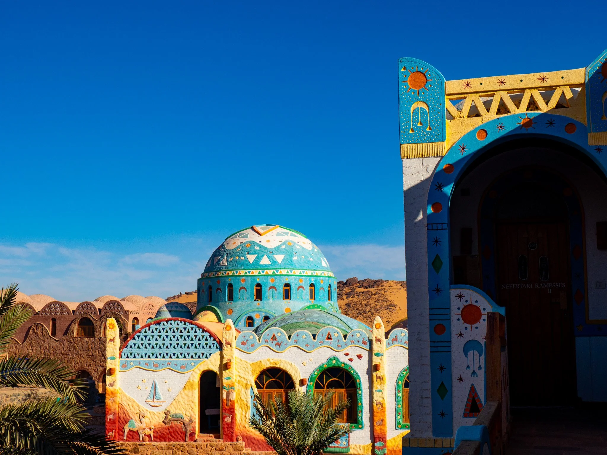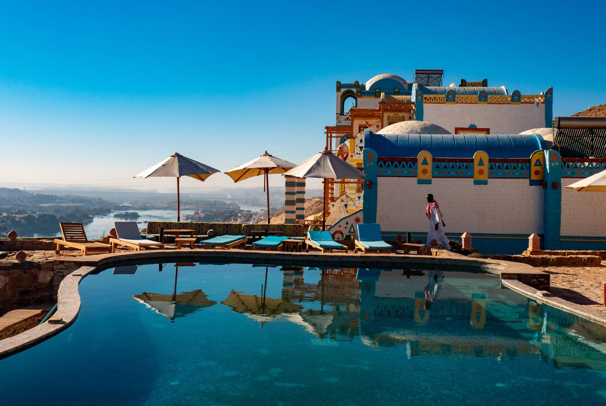 In Aswan, we stayed at Kato Dool Wellness Resort and this place was divine. Aswan is the heart of Nubia, and the hotel’s design, with its vibrant blues, domes, and geometric patterns, is a beautiful homage to Nubian culture. Sitting by the pool, enjoying a leisurely breakfast (not a buffet but we did have water glass, coffee glass, juice glass…all signs of a good time to come) while overlooking the wide expanse of the Nile River, was pure, unadulterated luxury.